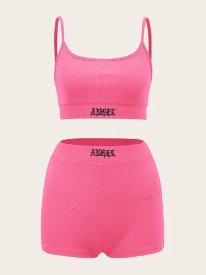 SHEIN PETITE Letter Embroidery Cami Crop Top & Biker Shorts Set - Pink - View 1