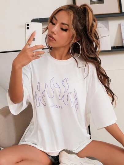 Letter & Fire Graphic Oversized Longline Tee - White - View 1