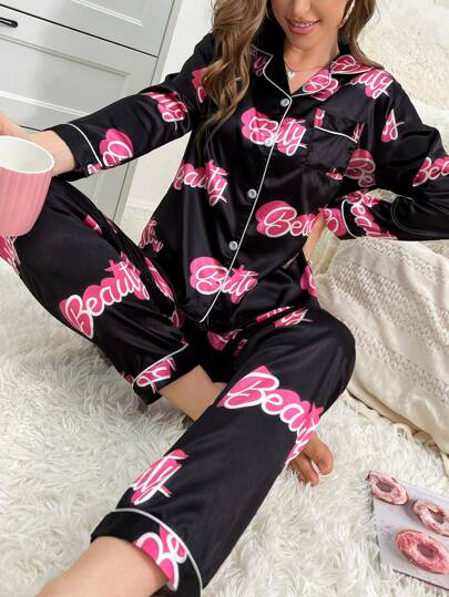 Letter Graphic Contrast Piping Satin PJ Set / Pajama Set, Fall Clothes Cozy And Elegant Details, Winter - Black - View 1
