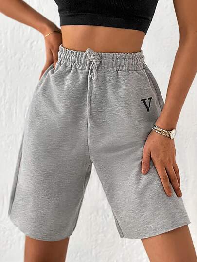 EURMUSE Letter Graphic Drawstring Waist Shorts - Light Grey - View 1