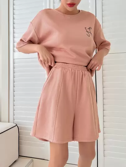 DAZY Letter Graphic Drop Shoulder Lounge Set Pajama - Dusty Pink - View 8