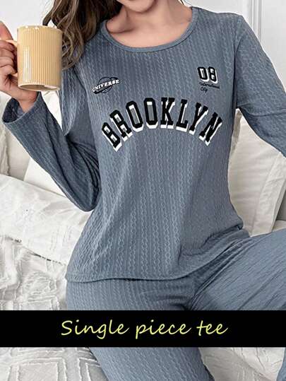 Miss Vinta Women's Casual Knitted Dusty Blue Brooklyn Letter Print Long Sleeve Loungewear Set With Round Neck - Dusty Blue - View 1