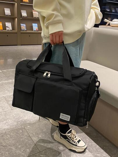 Letter Patch Decor Travel Bag Double Handle Sporty - Black - View 1