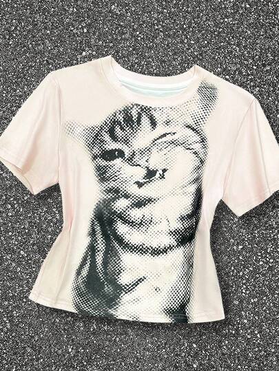 INAWLY Women's Cute Cat Graphic Short Round Neck T-Shirt For Summer - Baby Pink - View 5