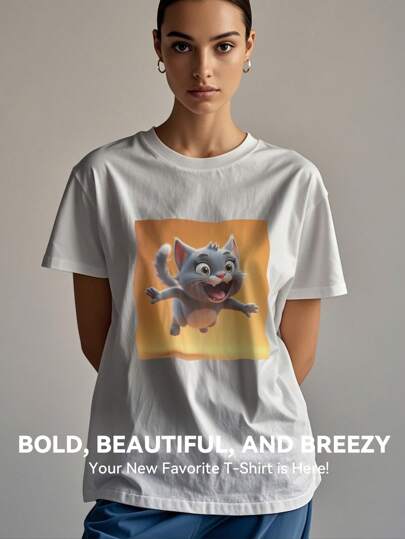 Women's Print Short Sleeve T-Shirt, Black & White Shirt, 180gsm Shirt, Crew Neck Short Sleeve T-Shirt, Breathable & Comfortable Casual Sports Fitness Tee, Casual Vintage Style, Suitable For Summer, Beach Holiday Crew Neck Short Sleeve Casual T-Shirt, Summer Tee - White - View 1