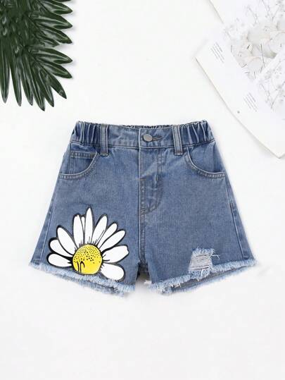 Little Girls' Floral Print Distressed Frayed Edge Denim Shorts - Light Wash - View 1