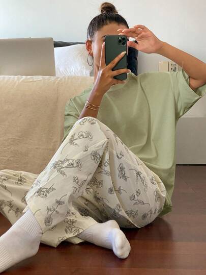 Áo thun rộng màu trơn và quần ngủ in họa tiết hoa, bộ đồ ngủ
