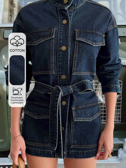 Livesso Women's Cinched Waist High Collar Casual Denim Jacket, Winter - Medium Wash - View 1