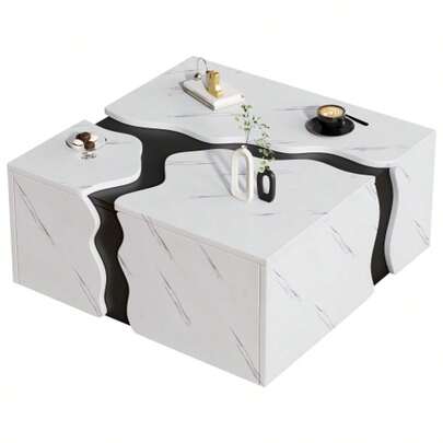 Living Room Coffee Table, 70 X 70 X 31 Cm, Cube-Shaped Geometric Design, Side Table With Drawer, Table With Marble Veneer In A Unique Shape, Coffee Table, Storage Table, Game Table - White - View 1