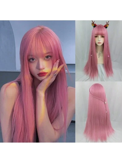 Long Pink-Blue Synthetic Straight Wig With Bangs, Fluffy & Natural, Lolita Style, Heat Resistant, Suitable For Daily Wear And Parties - Pink - View 1