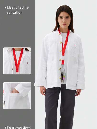 Long Sleeve Multi-Pocket Jacket, Fashionable Workwear For Lab, Beauty Salon, Lightweight Casual Outerwear - White - View 7