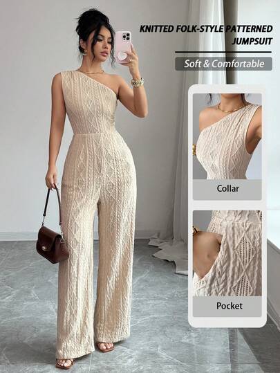 Louniche Elegant One-Shoulder Ruched Jumpsuit, Fitted Waist, Casual Everyday Wear, Date Night, Wedding Season Party, Middle East UAE Textured Light Apricot - Apricot - View 1