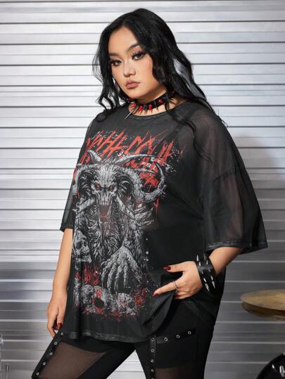 ROMWE Grunge Punk Punk Skeleton Print See-Through Loose Plus Size T-Shirt - Black - View 1