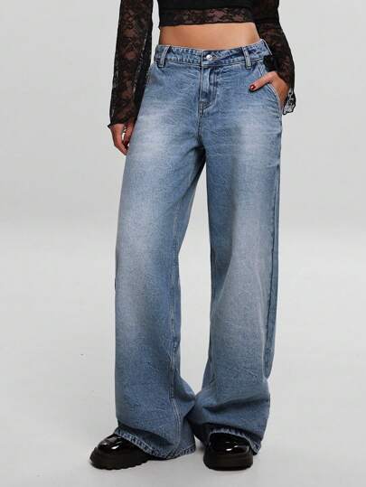 EURMUSE Low Waist Wash Detailed Wideleg Jean - Medium Wash - View 1