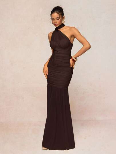 Lumalex Women's Halter Neck Chiffon Dress With Ruffled Bust Pads And Flowy Dress - Coffee - View 1