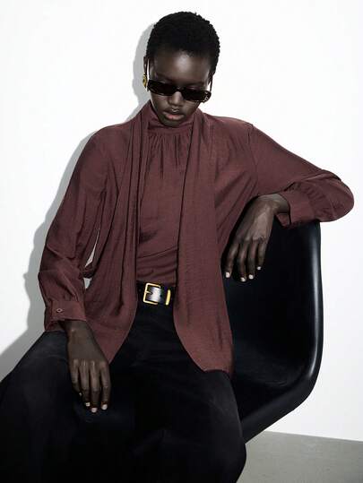Lumivelle Women's Autumn Loose Fit Tie Collar Blouse - Maroon - View 6