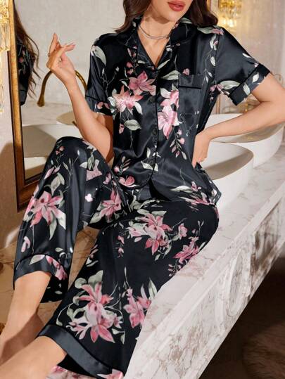 LuxeNights Faux Silk Floral Print Collar Shirt & Long Pants Pajama Set - Black - View 1