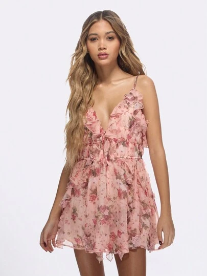 MISSGUIDED Ruffle Mini Dress Floral Print Chiffon V-Neck Summer Party Wedding Guest Special Occasion Tea Spaghetti Strap Flowy - Coral Pink - View 1