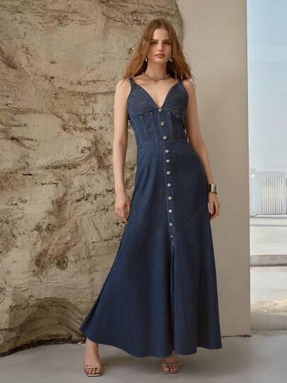 MOTF PREMIUM DENIM FOLD PLEATED BUST SLIP DRESS, SPRING/SUMMER - Dark Wash - View 1