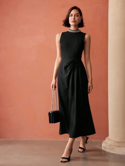 MOTF PREMIUM FAUX PEARL AND BEADED MOCK NECK RUCHED WAIST LONG DRESS - Black - View 1