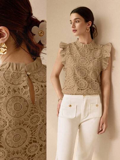 MOTF PREMIUM GUIPURE LACE SOLID FRILL MOCK NECK RUFFLE ARMHOLE TOP - Khaki - View 1