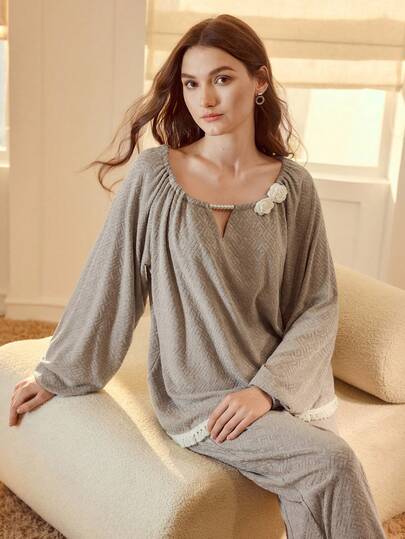 MOTF PREMIUM STEREO FLORAL LANTERN SLEEVE TOP & PANTS LOUNGE SET - Coffee Brown - View 4