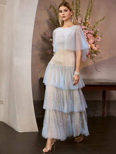 MOTF PREMIUM WOMEN'S NEW BLUE MESH BEADED LAYERED DRESS, ETHEREAL SHEER RUFFLE HEM MAXI DRESS, BANQUET RUNWAY EVENING GOWN - Blue - View 1