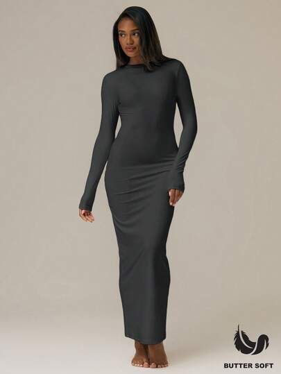 MUSERA ESSENTIALS Buttery Soft Long Sleeve Fitted Midaxi Dress Basic Spring Summer Cute Casual Vacation, Dress For Women Ibiza Beach Holiday Fall Night Out Wedding Guest, Elegant, Birthday, Night Out, Date Night Casual Dress  New Year  Party - Dark Grey - View 1