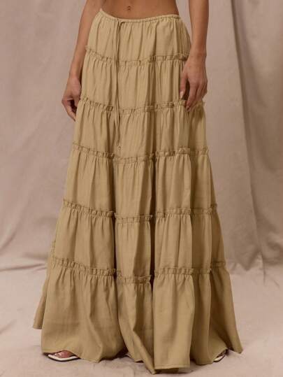 MUSERA Low Rise Drawstring Waist Floaty Tiered Elegant Boho Romantic Linen Feel Maxi Skirt For Summer Vacation Holiday Beachwear Ibiza Mineral - Green - View 1
