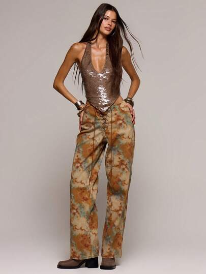MUSERA Peacock Print Lace Up Straight Leg Printed Jeans Cool Girl Streetstyle Going Out Fall Autumn Winter - Multicolor - View 1