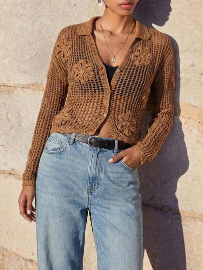 Maija 3D Floral Hollow-Out Knitted Long Sleeve Cardigan - Coffee Brown - View 1
