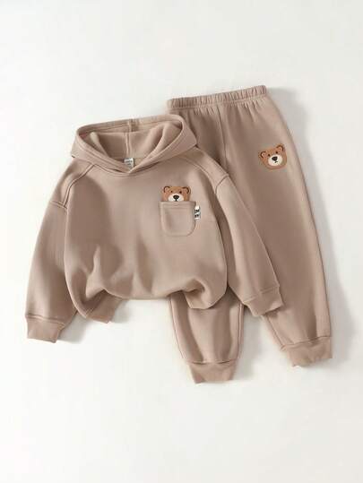 Maija Kids 2pcs Young Boy Bear Pattern Knitted Hoodie And Pants Casual Outfit - Coffee Brown - View 1
