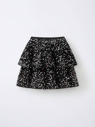 Maija Kids Young Girl Velvet Sequin Double Ruffle Hem Casual Elegant Skirt - Black - View 1