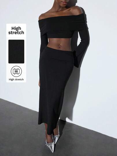Maija Women's Black Solid Off Shoulder Long Sleeve Bell Cuff Cropped Top & High Waist Slim Fit Elastic Waist Versatile Skirt 2 Pieces Set, Suitable For Early Spring, Daily, Party, Holiday - Black - View 1