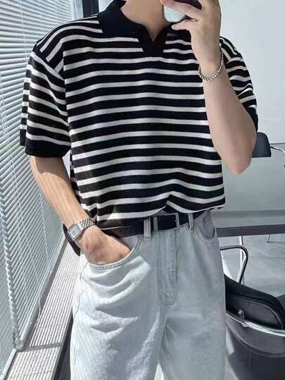 Manfinity CasualKnits Men's Striped Contrast Collar Casual Knit Sweater - Black and White - View 1