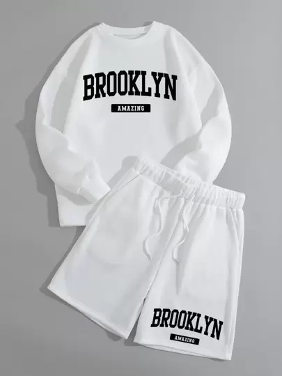 Manfinity Dauomo Men Letter Graphic Thermal Lined Sweatshirt & Drawstring Waist Shorts - White - View 1
