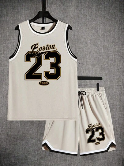 Manfinity EMRG 2pcs Men's Crew Neck Sleeveless Numeric & Letter Printed Top And Drawstring Fashionable Shorts, Khaki Mesh Tank Outfit - Khaki - View 1