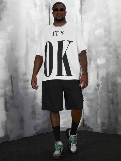 Manfinity RebelGame Loose Plus Size Men Slogan Print Drop Shoulder T-Shirt And Shorts Set - Black and White - View 1