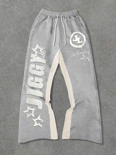 Manfinity EMRG Men's Color Block Letter Graphic Drawstring Waist Sweatpants, For Rave - Light Grey - View 1