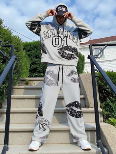 Manfinity Roghcode Men's Long Sleeve Printed Minimalist Hoodie And Pants Set - Grey - View 1
