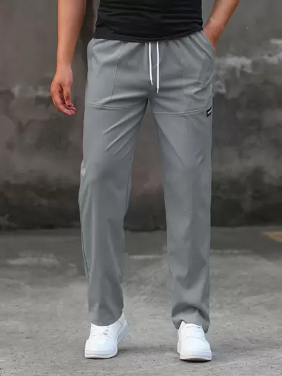 Manfinity Homme Loose Fit Men's Letter Patched Straight Leg Pants With Drawstring Waist, Fall - Grey - View 1