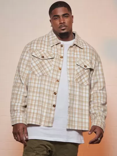 Manfinity Homme Men Plus Plaid Print Flap Pocket Shacket - Apricot - View 1
