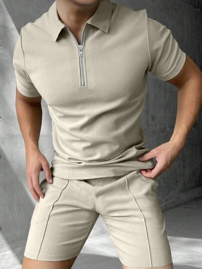 Manfinity Homme Men's Plus Size Solid Color Short Sleeve Polo Shirt And Shorts Set - Apricot - View 1