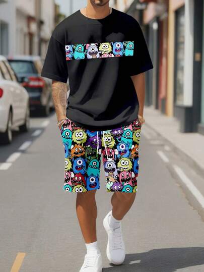 Manfinity Homme Men's Summer Casual Cartoon Print T-Shirt Shorts Set - Black - View 1