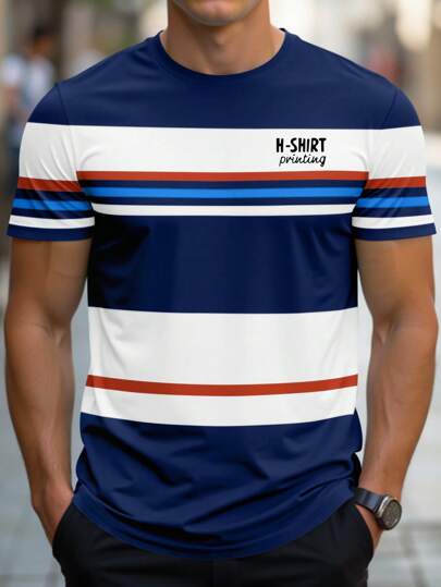 Manfinity Homme Men's Summer Letter Striped Crew Neck Short Sleeve Casual T-Shirt - Navy Blue - View 1