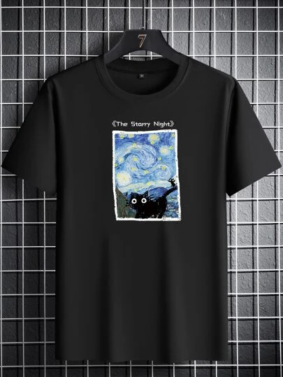Manfinity Hypemode Men T-Shirts Fit Crew Neck Short Sleeve Graphic Tee The Starry Night Casual Funny Summer Polyester - Black - View 1