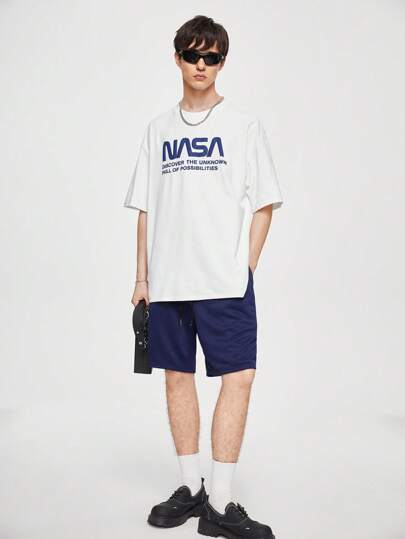 Manfinity Hypemode Men's Summer Slogan Printed Round Neck Drop Shoulder Sleeve Casual T-Shirt And Drawstring Waist Shorts Set - Black and White - View 1