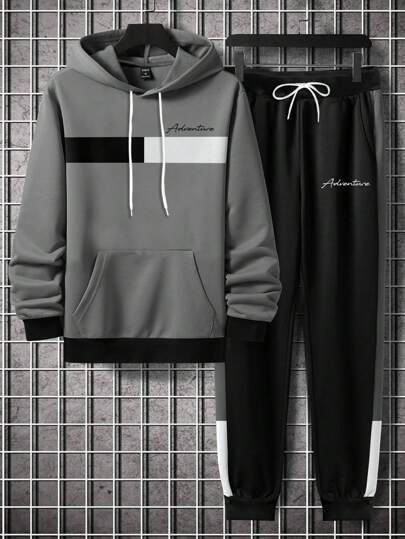 Manfinity Homme Men Letter Graphic Kangaroo Pocket Drawstring Hoodie & Sweatpants - Grey - View 1