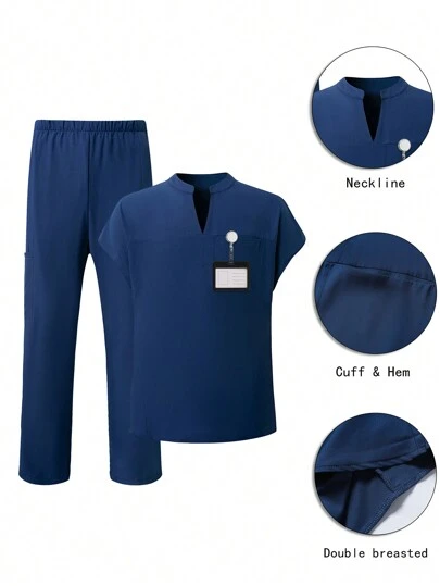 Manfinity Homme Men's Solid V-Neck Short Sleeve Top And Pants Casual Medical/Nursing Uniform Set - Blue - View 1