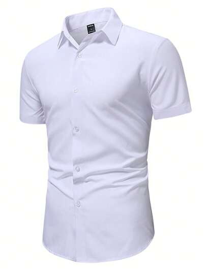 Manfinity Mode Men Casual Solid Plain Button Up Short Sleeve Dress Shirt, For Work, Business - White - View 1